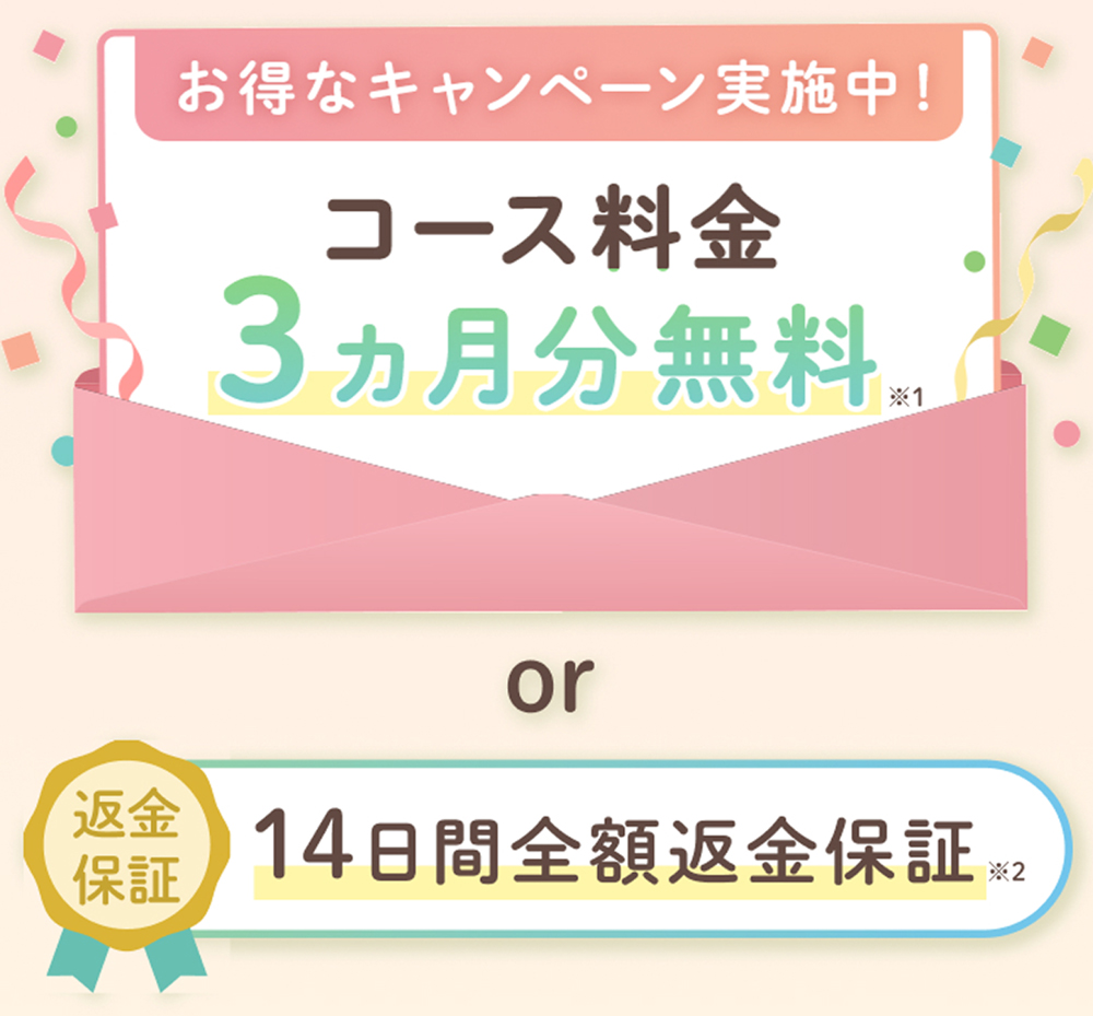 さらに通常コースなら無料カウンセリング参加で14日間の全額返金保証かコース料金3ヶ月無料が選べる、大型キャンペーンも現在実施中です。